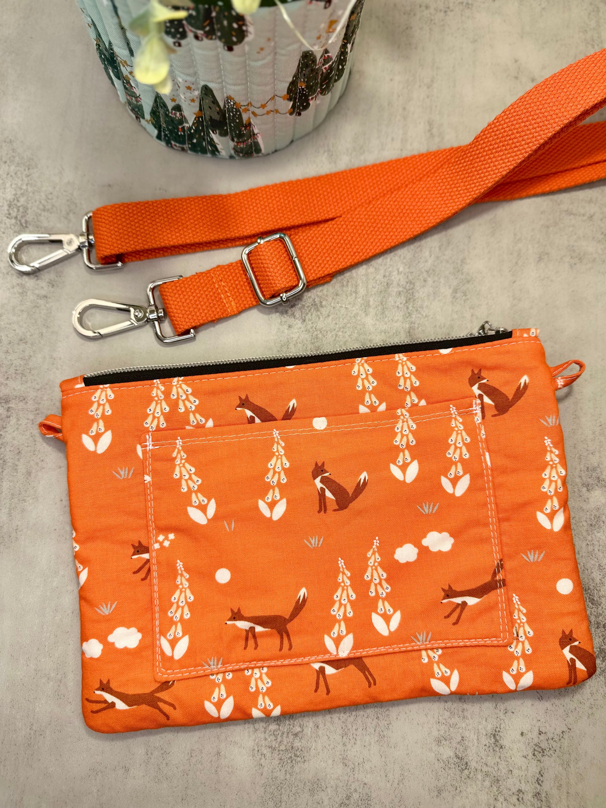 Gorgeous crossbody bag with orange frolicking fox fabric. Three different zippered compartments. Perfect bag for on the go, not too big, but big enough to hold all your most important things!